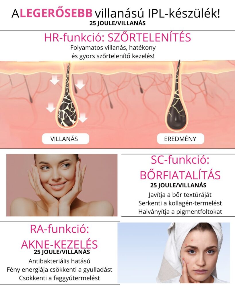 Mi az IPL? A készülék egy-egy pillanatig tartó nagyon erős fényt bocsátanak ki a bőrre. Mivel a fényt a sötétebb felületek nyelik el és alakítják hővé, így ez a fény a világosabb bőrt nem, de az annál sötétebb szőrt hirtelen nagyon felmelegíti, felforrósítja. Minél világosabb a bőröd és sötétebbek a szőrszálak, annál jobb a fényimpulzusok elnyelődése. A gyengéd fényimpulzusoknak köszönhetően a tüszők nyugalmi állapotba lépnek. Ennek következtében a szőrszálak növekedése fokozatosan csökken. A szőrszálak növekedésében különböző fázisok váltják egymást (aktív, átmeneti, nyugalmi fázis). Az IPL az épp növekedési fázisban lévő szőrszálakra hat, ezért a kezelést többször meg kell ismételni, hogy idővel minden szőrszál növekedési fázisában „villantsunk”.